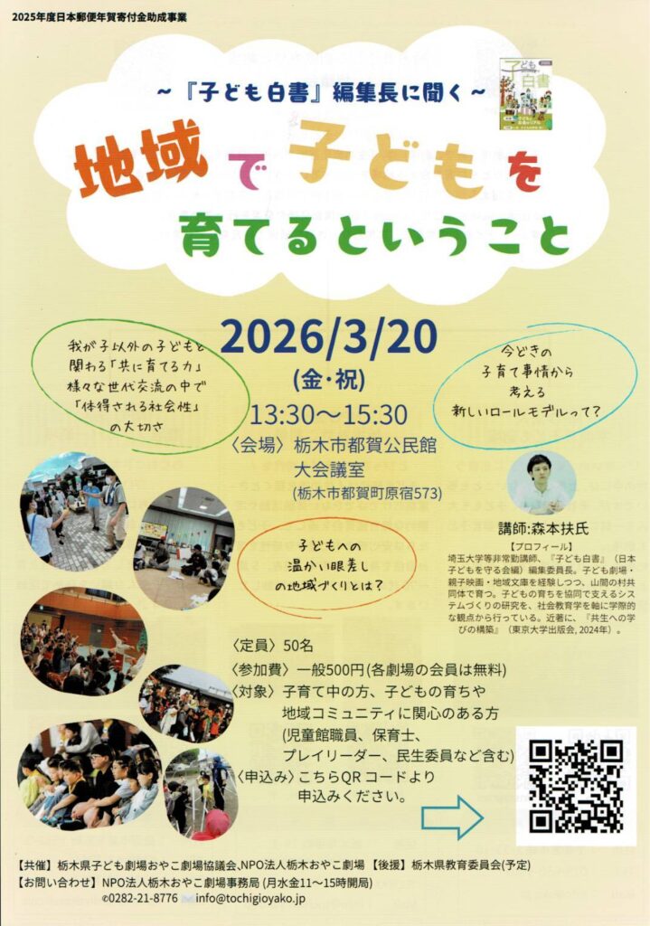 このたび栃木おやこ劇場では、栃木県子ども劇場おやこ劇場協議会との共催で、『こども白書』(日本子どもを守る会編)の編集委員長をつとめる森本扶さんをお招きすることになりました。